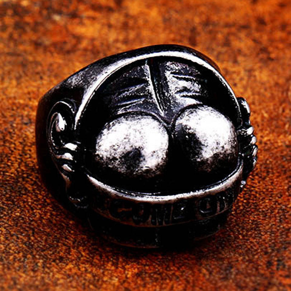 お尻の部分に英語でCOME ONとデザインした挑発的でおもしろなステンリング。